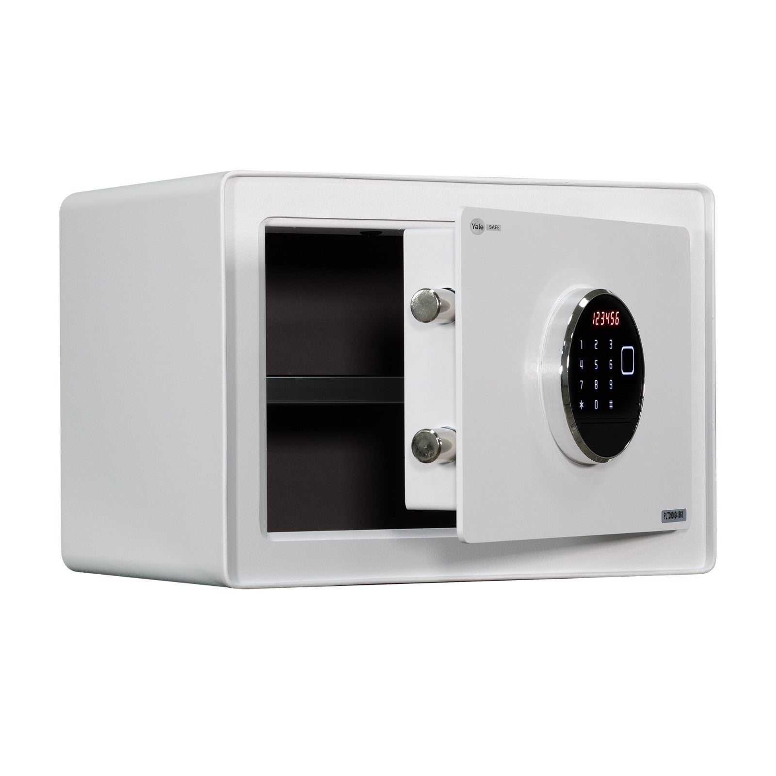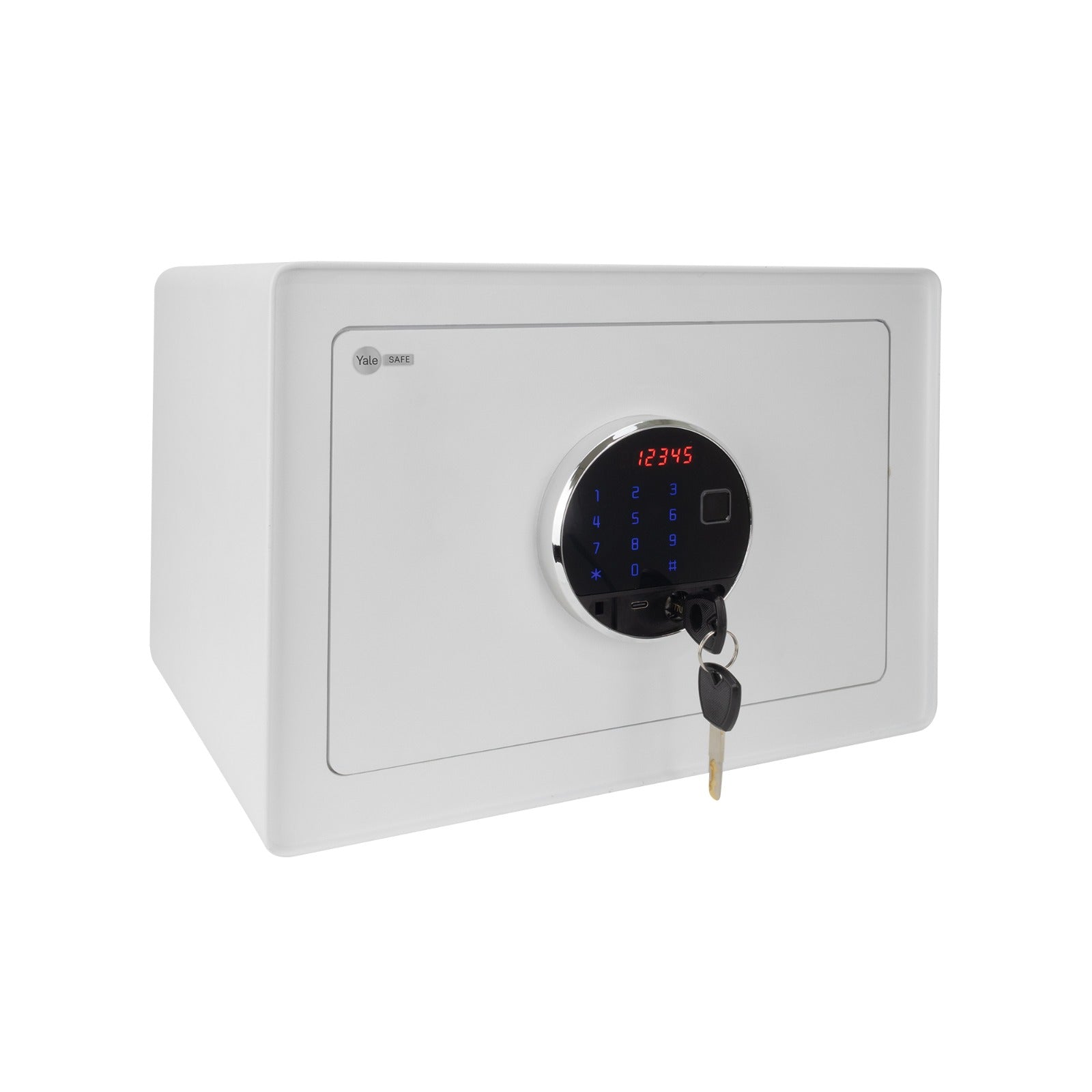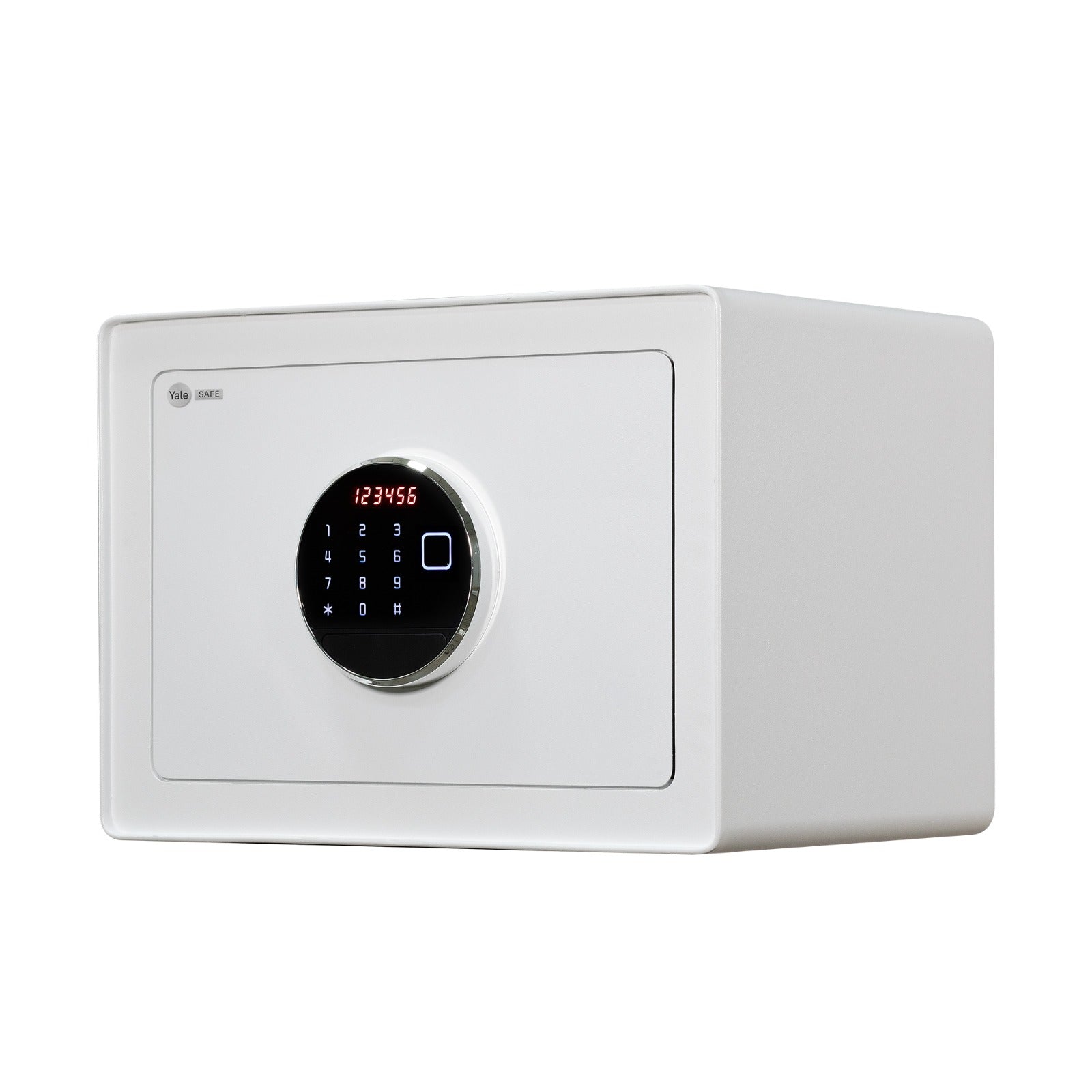 Descubre la caja fuerte biométrica Yale, elegante y segura digital en color blanco, equipada con un avanzado teclado electrónico. Este modelo ofrece un acceso rápido y seguro, permitiéndote abrirla con un simple toque. Si se te acaban las pilas, puedes cargarla desde el puerto auxiliar.
