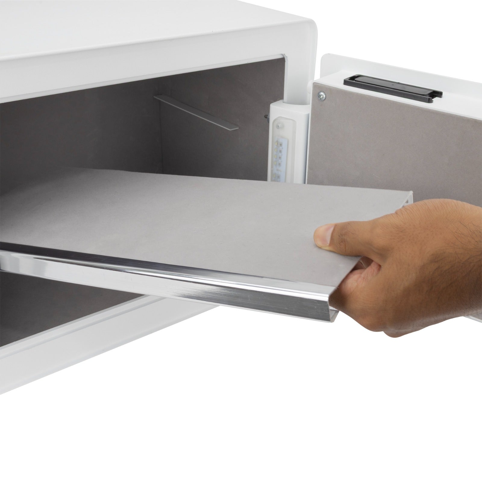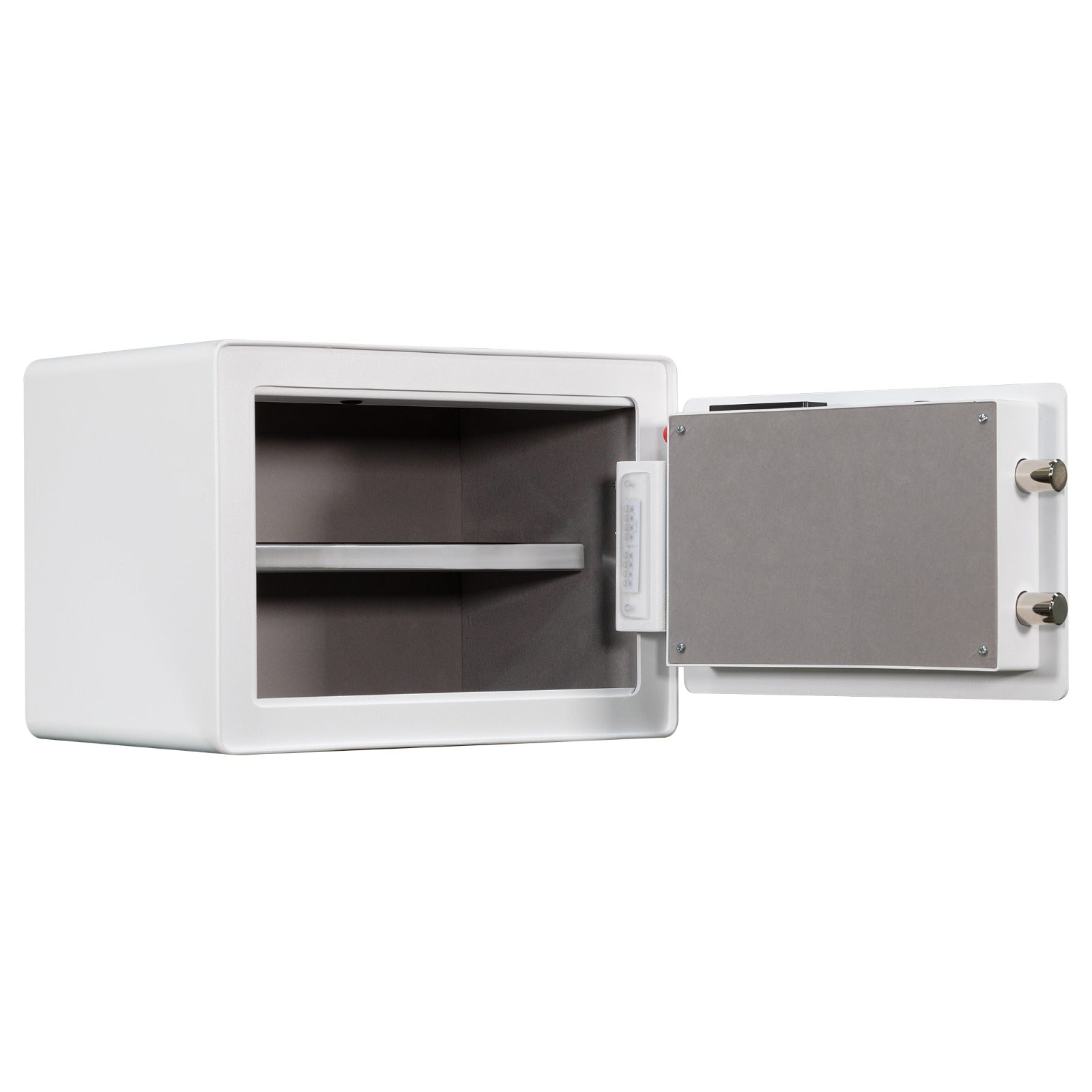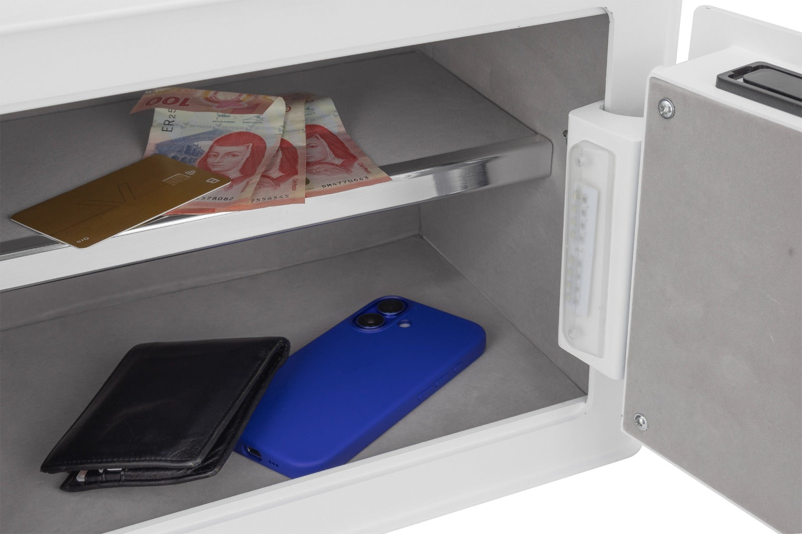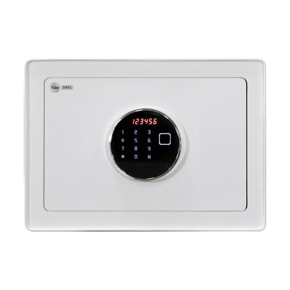 Descubre la caja fuerte biométrica Yale, elegante y segura digital en color blanco, equipada con un avanzado teclado electrónico. Este modelo ofrece un acceso rápido y seguro, permitiéndote abrirla con un simple toque. Si se te acaban las pilas, puedes cargarla desde el puerto auxiliar.