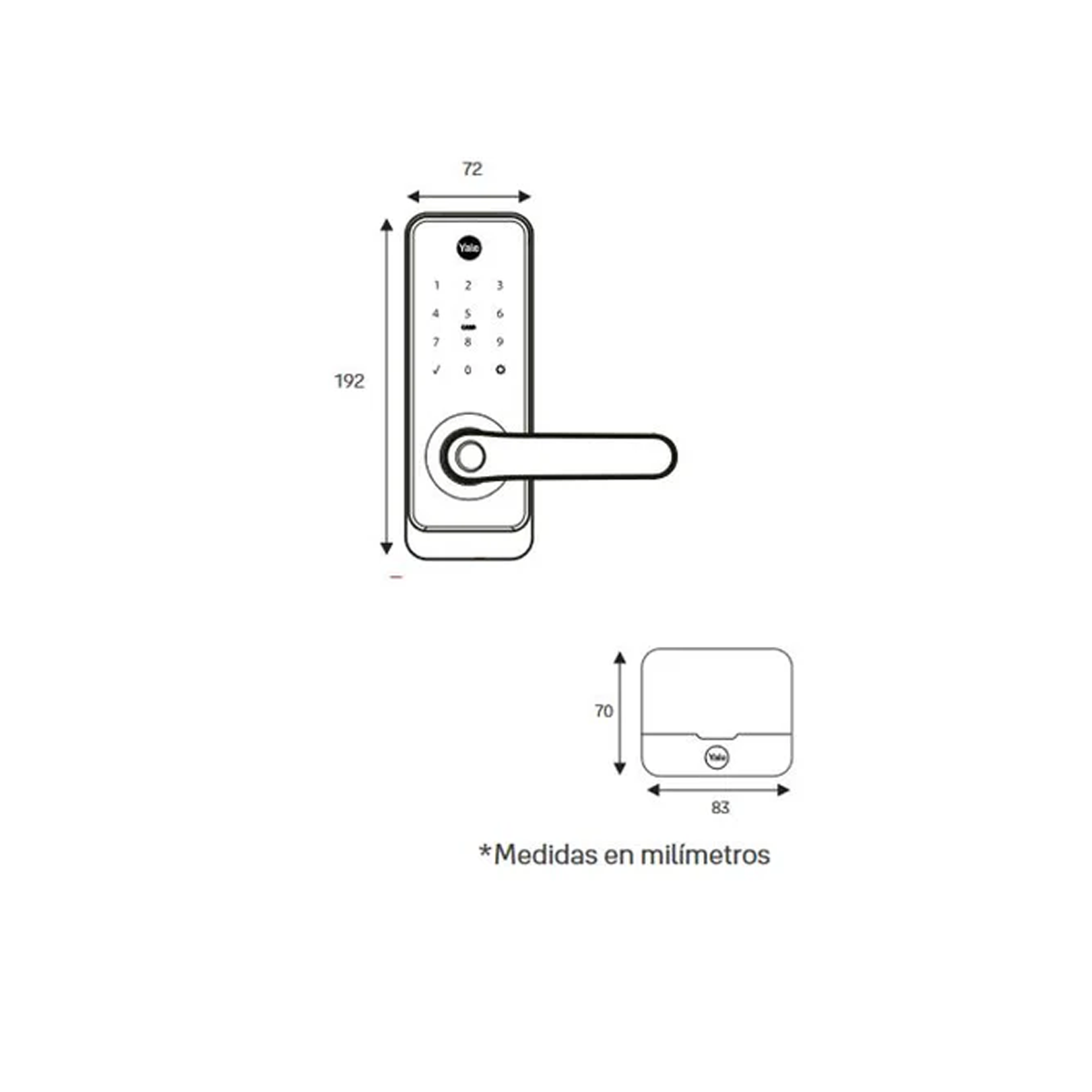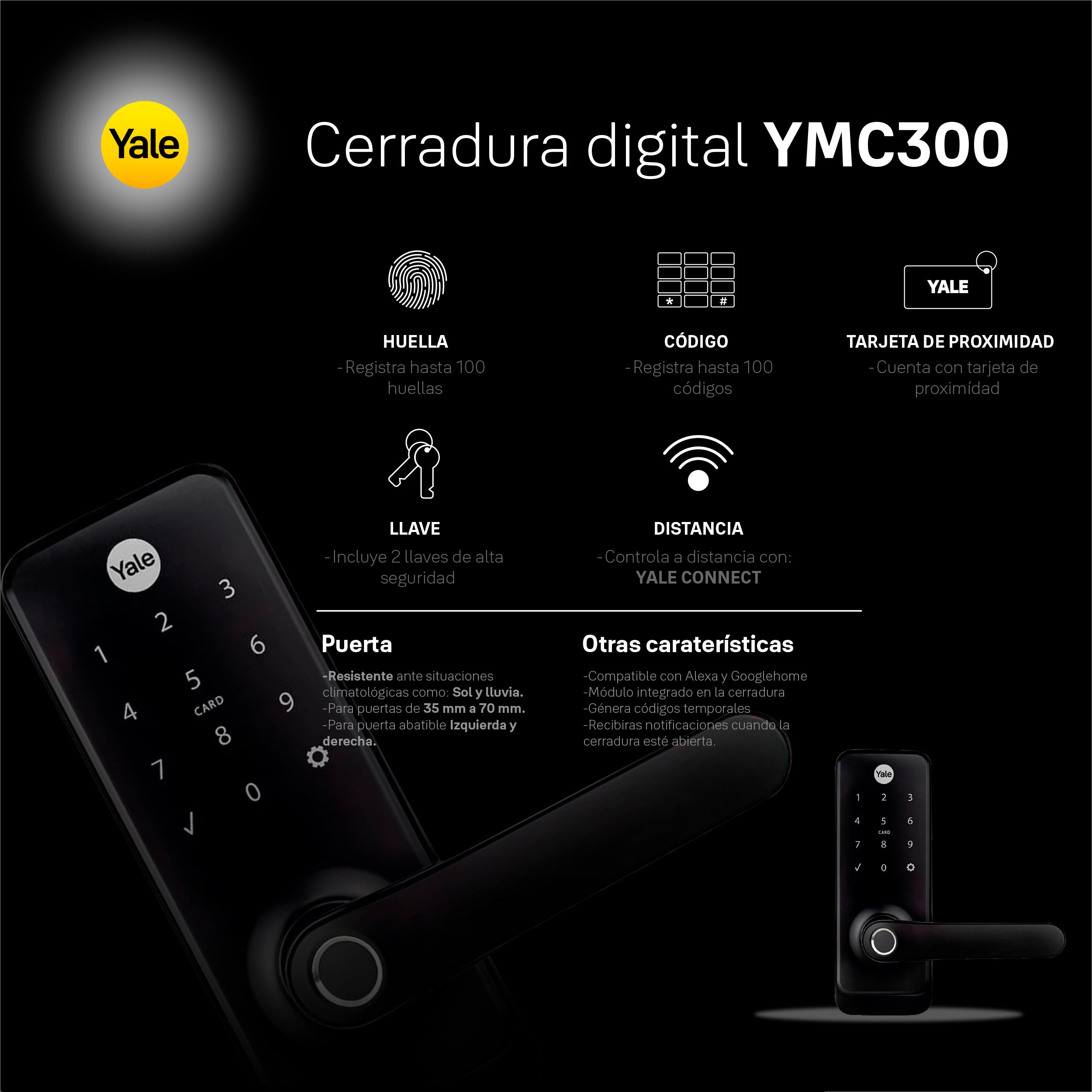 Incluye: Cerradura digital YMC300, hub Wi-Fi, tarjetas RFID, llaves mecánicas de respaldo, kit completo de instalación y manual en español.