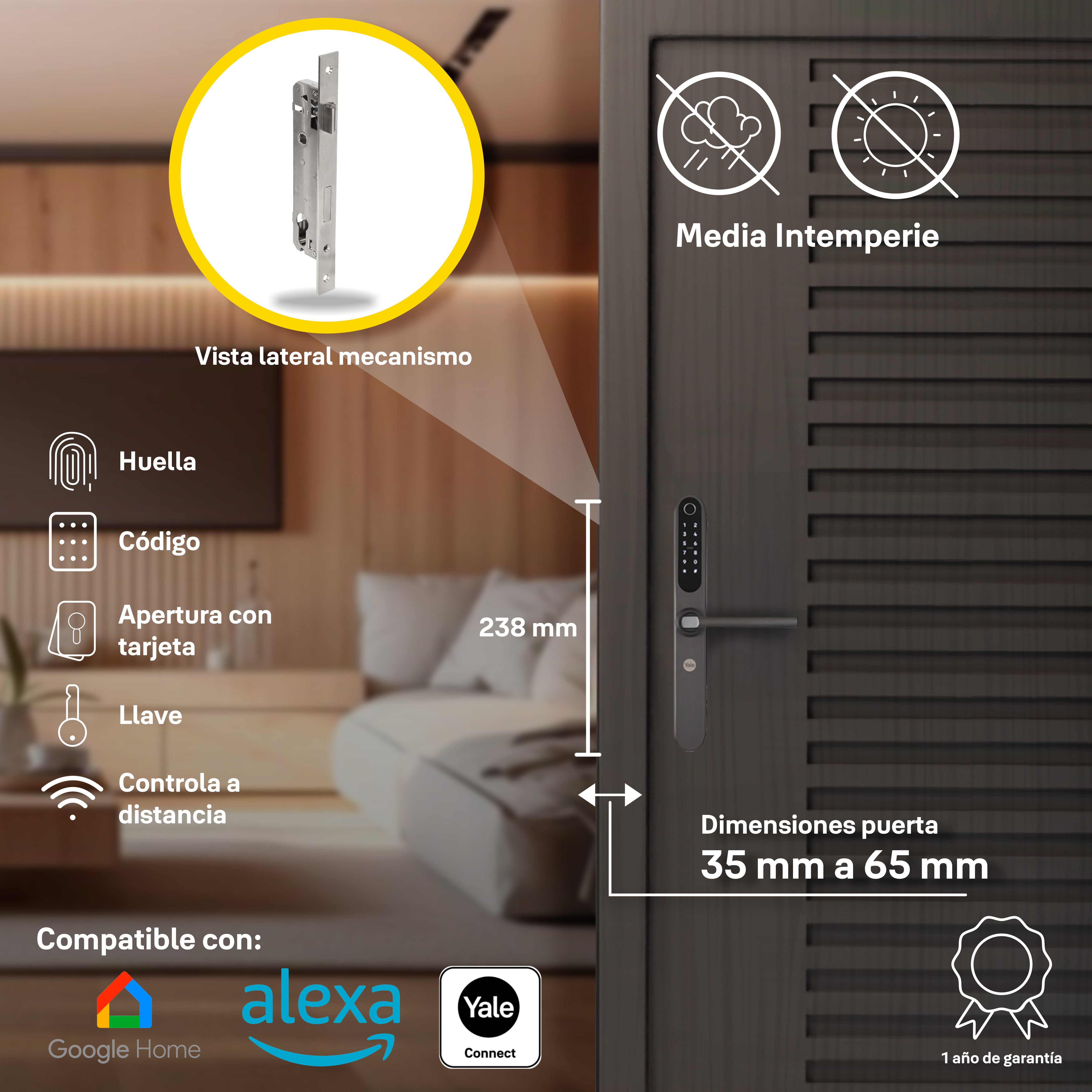 Transforma tu puerta en una entrada inteligente con la cerradura digital Yale YSD100 en elegante acabado Gun Metal 5085. Diseñada específicamente para puertas de madera, esta cerradura combina tecnología de vanguardia con la calidad y confiabilidad que solo Yale puede ofrecer.