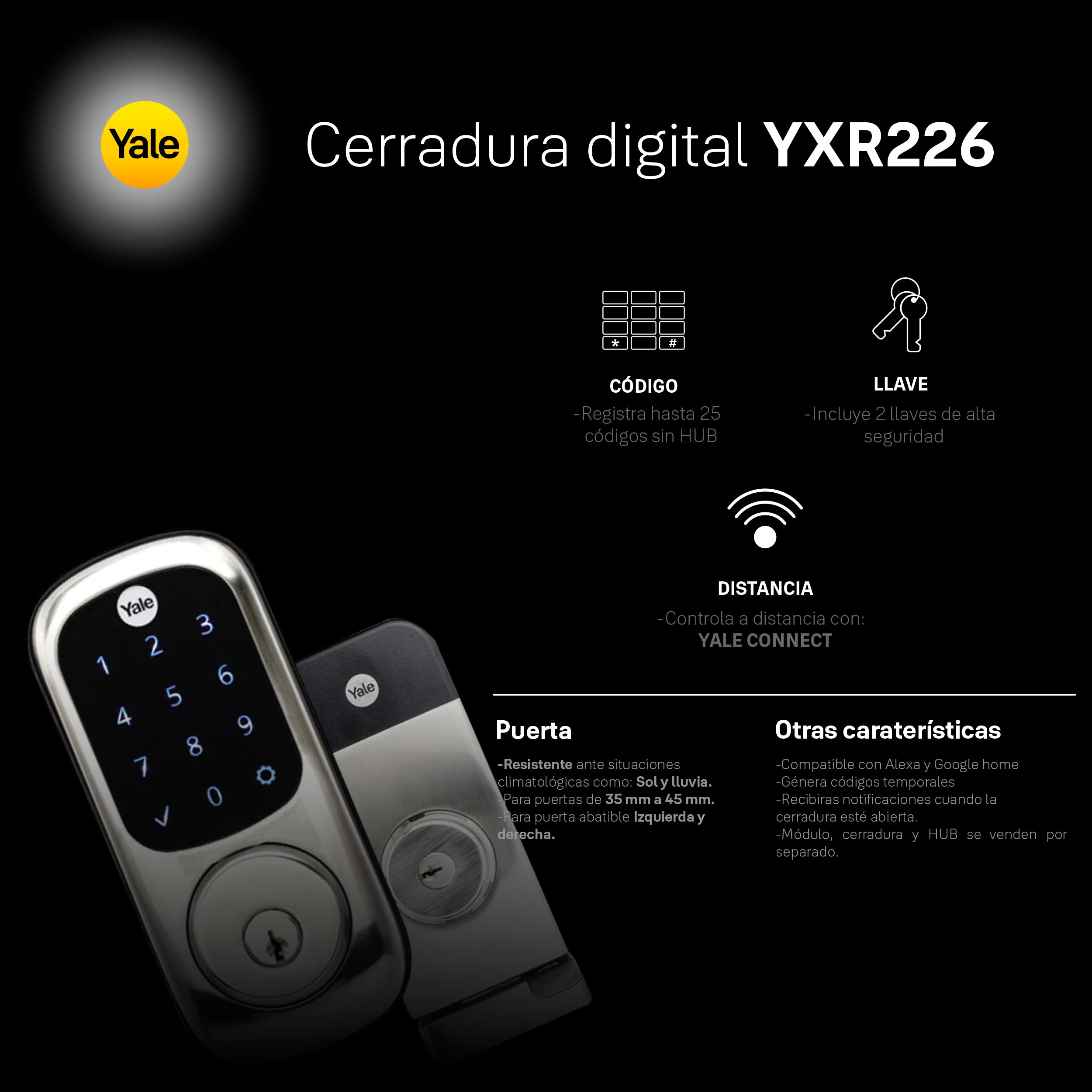 La Cerradura Digital Yale YXR226 está diseñada específicamente para resistir las condiciones más exigentes del exterior. Con su construcción robusta y tecnología avanzada, protege tu hogar o negocio con la máxima seguridad.