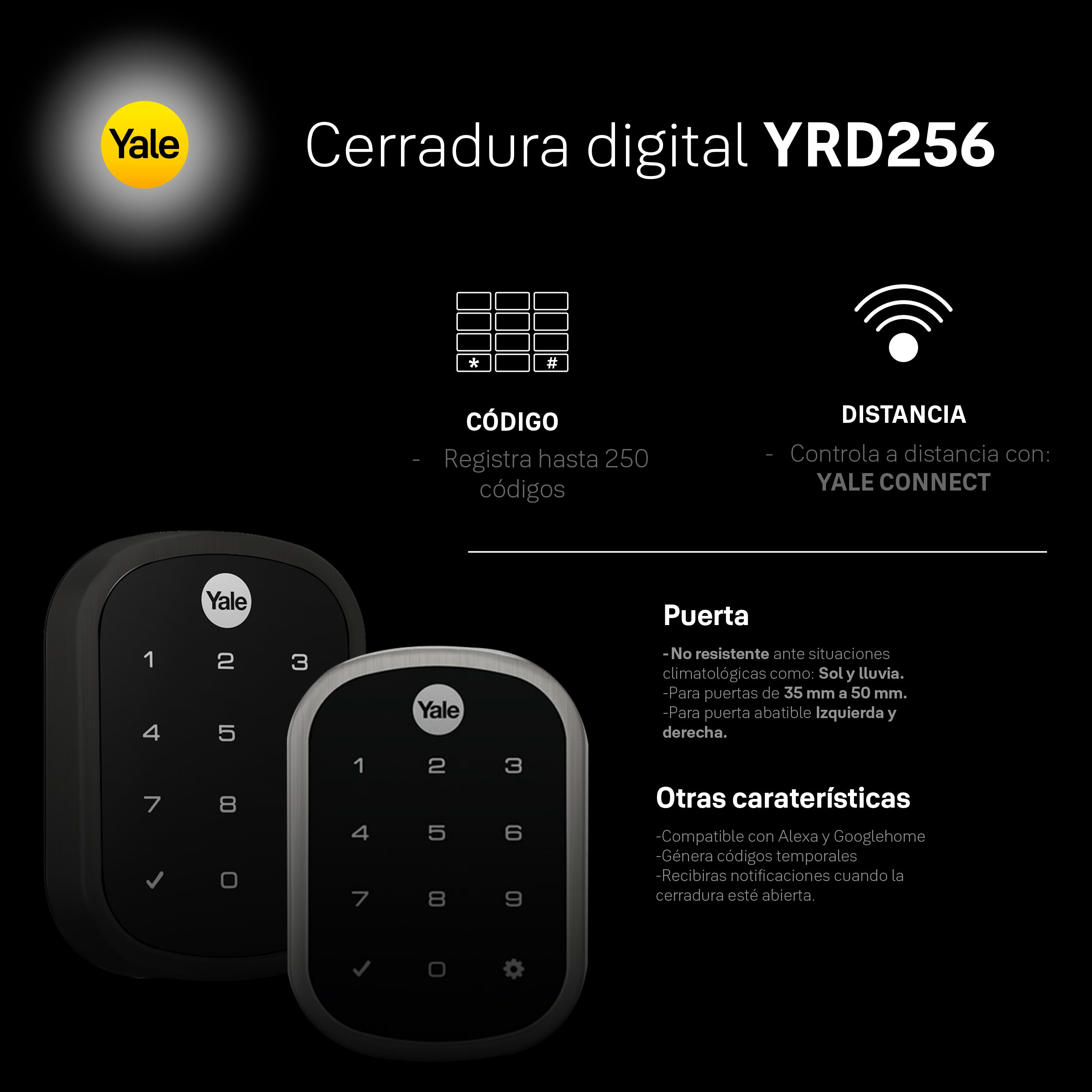 Transforma la seguridad de tu hogar u oficina con la Cerradura Digital Yale YRD256, una solución inteligente que combina tecnología de vanguardia con diseño sofisticado en acabado negro.